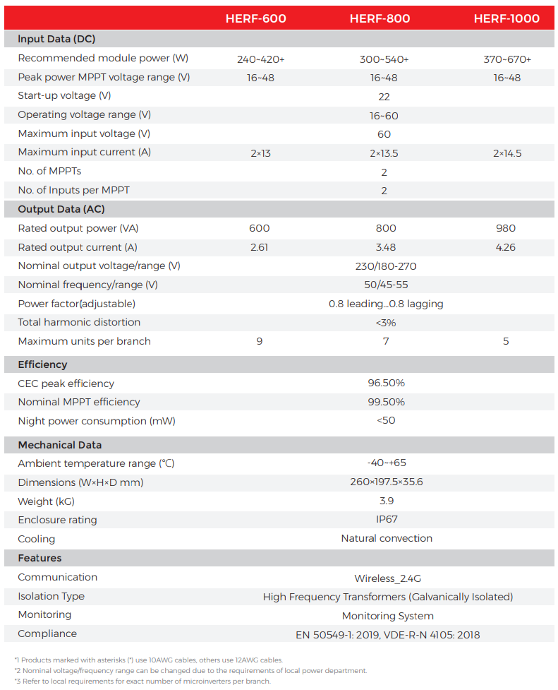 The HERF-800 is a micro-inverter from Estar Energy (brand HERF), designed to connect individual solar panels to the grid (grid-tie system). It converts the direct current (DC) from solar panels to alternating current (AC) that can be fed directly into your home or electricity grid. It is suitable for outdoor installations, for small to medium-sized solar power systems, such as balcony power systems, garage roofs, and small PV arrays.