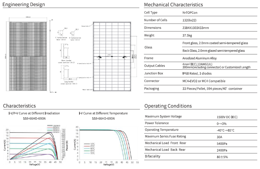 The SolarSpace SS9-66HD 700 Wp Silver Frame panel is a powerful, modern n-type monocrystalline solar panel with bifacial glass-glass construction. Thanks to its high-quality cell technology and robust module design, this panel offers high efficiency, strong performance, and a long lifespan, making it ideal for both residential and commercial installations seeking maximum yield.