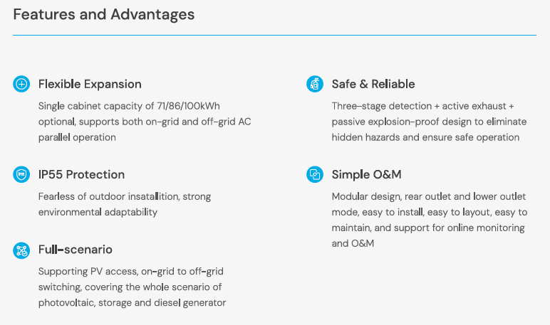 | Behuizing / Afmetingen | Breedte × Diepte × Hoogte: 1200 × 1205 × 2260 mm (voor 100 kWh versie genoemd) |